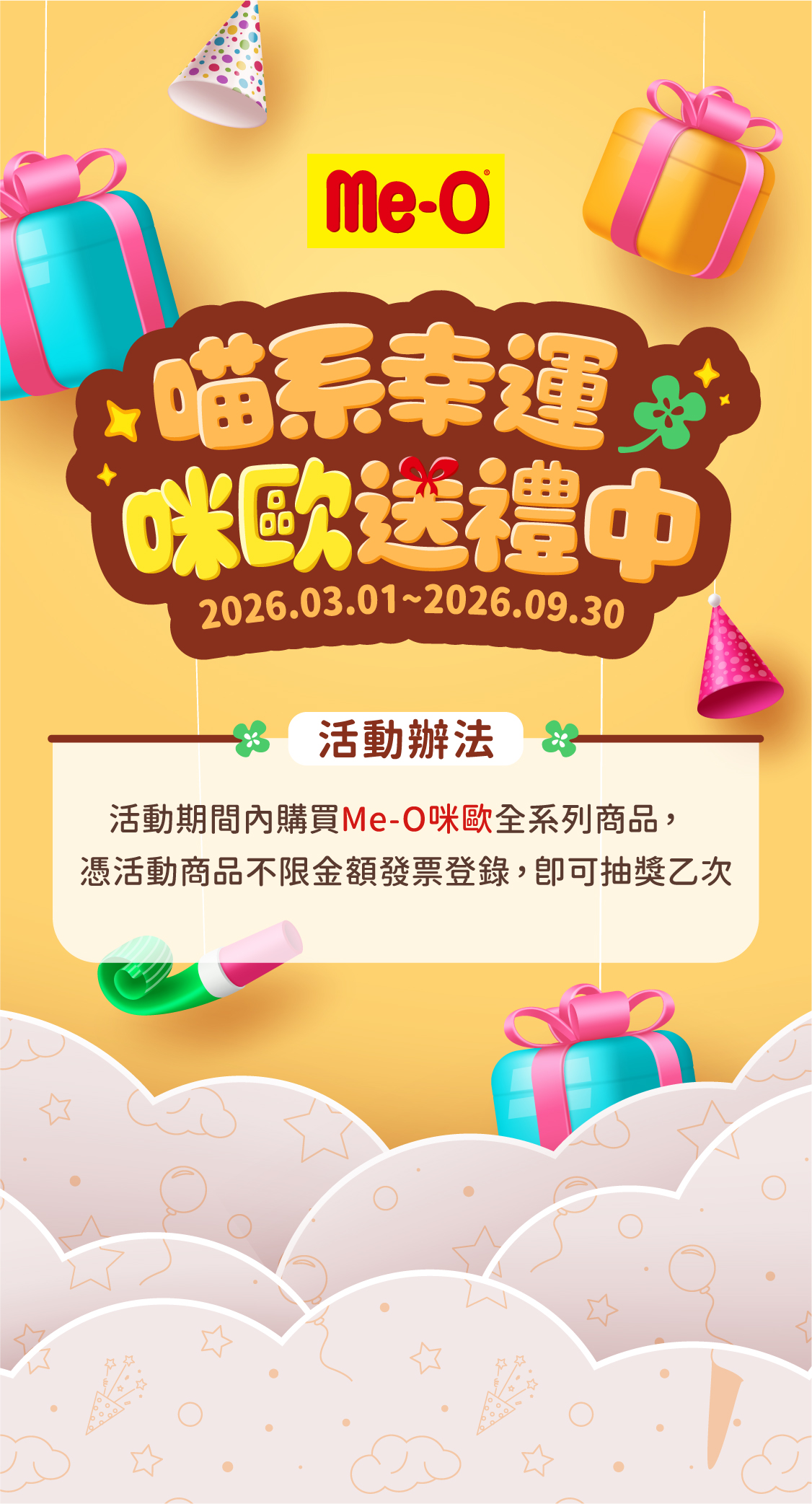 活動期間內購買Me-O咪歐全系列商品,不限金額,憑消費發票登錄後即可抽獎乙次🎁